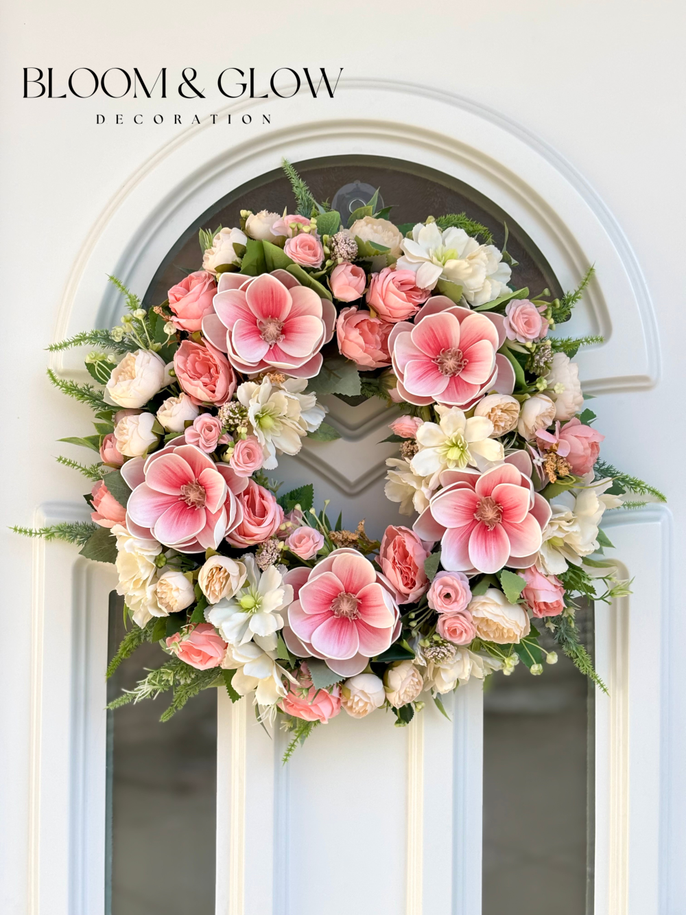 Rózsaszín és fehér árnyalatokban készült élethű magnóliás ajtódísz.