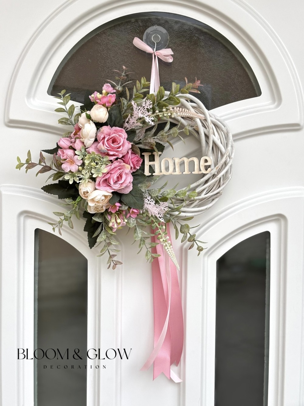 Vessző alapra készült pasztell rózsaszín virágos kopogtató Home felirattal.